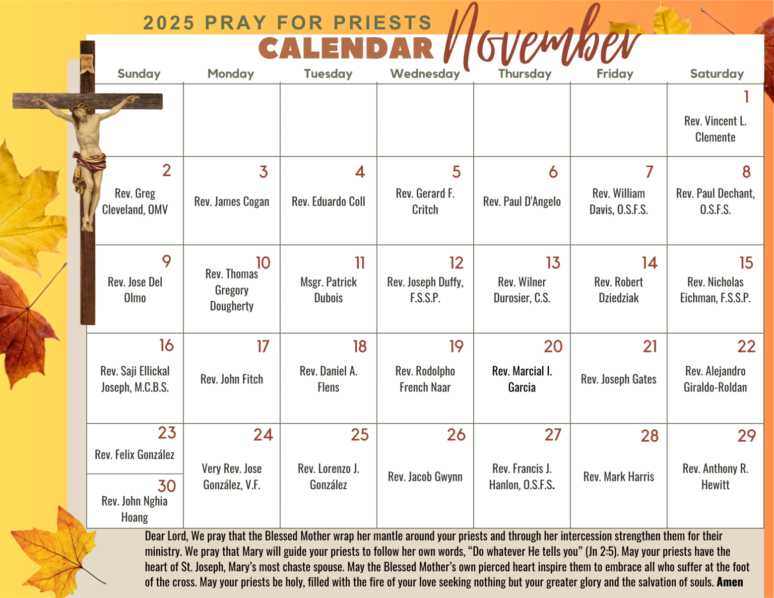 Dear Lord, we pray that the Blessed Mother wrap her mantle around your priests and through her intercession strengthen them for their ministry. We pray that Mary will guide your priests to follow her own words, "Do whatever He tells you" (Jn 2:5). May your priests have the heart of St. Joseph, Mary's most chaste spouse. May the Blessed Mother's own pierced heart inspire them to embrace all who suffer at the foot of the cross. May your priests be holy, filled with the fire of your love seeking nothing but your greater glory and the salvation of souls. Amen.